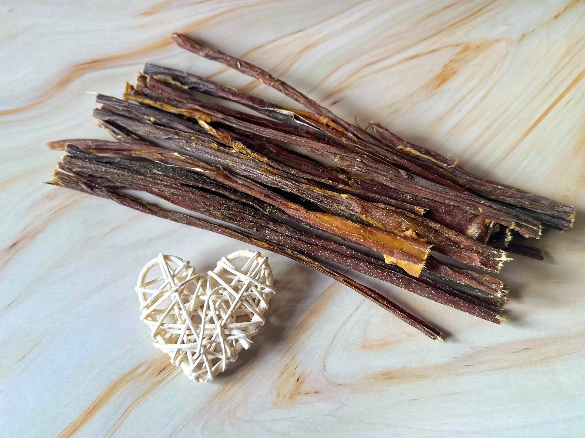 Our Beef Spaghetti is a completely natural, 100% beef dog treat. Made from cooked, then air dried, cow intestines, this is a slightly elastic, tasty snack. It offers chewing pleasure without any risk of large pieces splintering, and can be cut with scissors into small treats, making an awesome high-value reward during training.