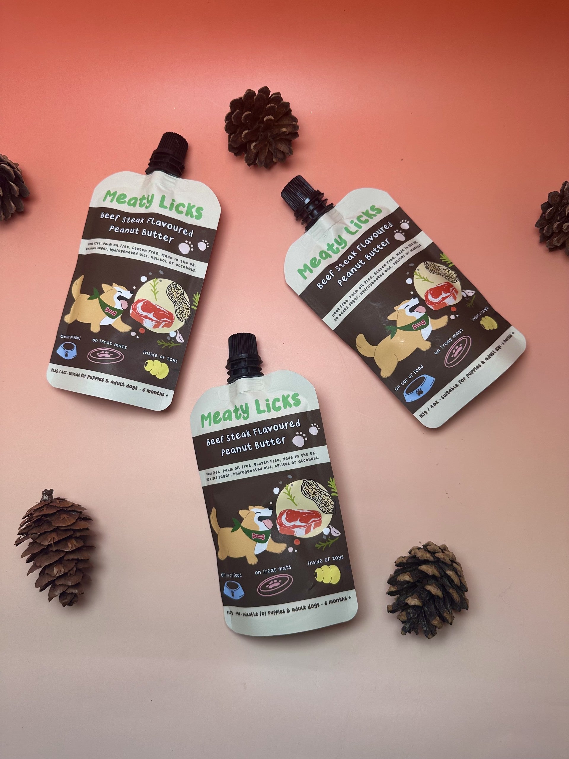 Introducing Meaty Licks—a premium range of vegan, gluten-free peanut butter pouches. These Meaty Licks offer a delicious and nutritious treat that enhances your dog’s daily routine with enrichment and flavour. Made with the highest quality ingredients, Meaty Licks is perfect for dogs with dietary sensitivities or for pet owners seeking plant-based options.