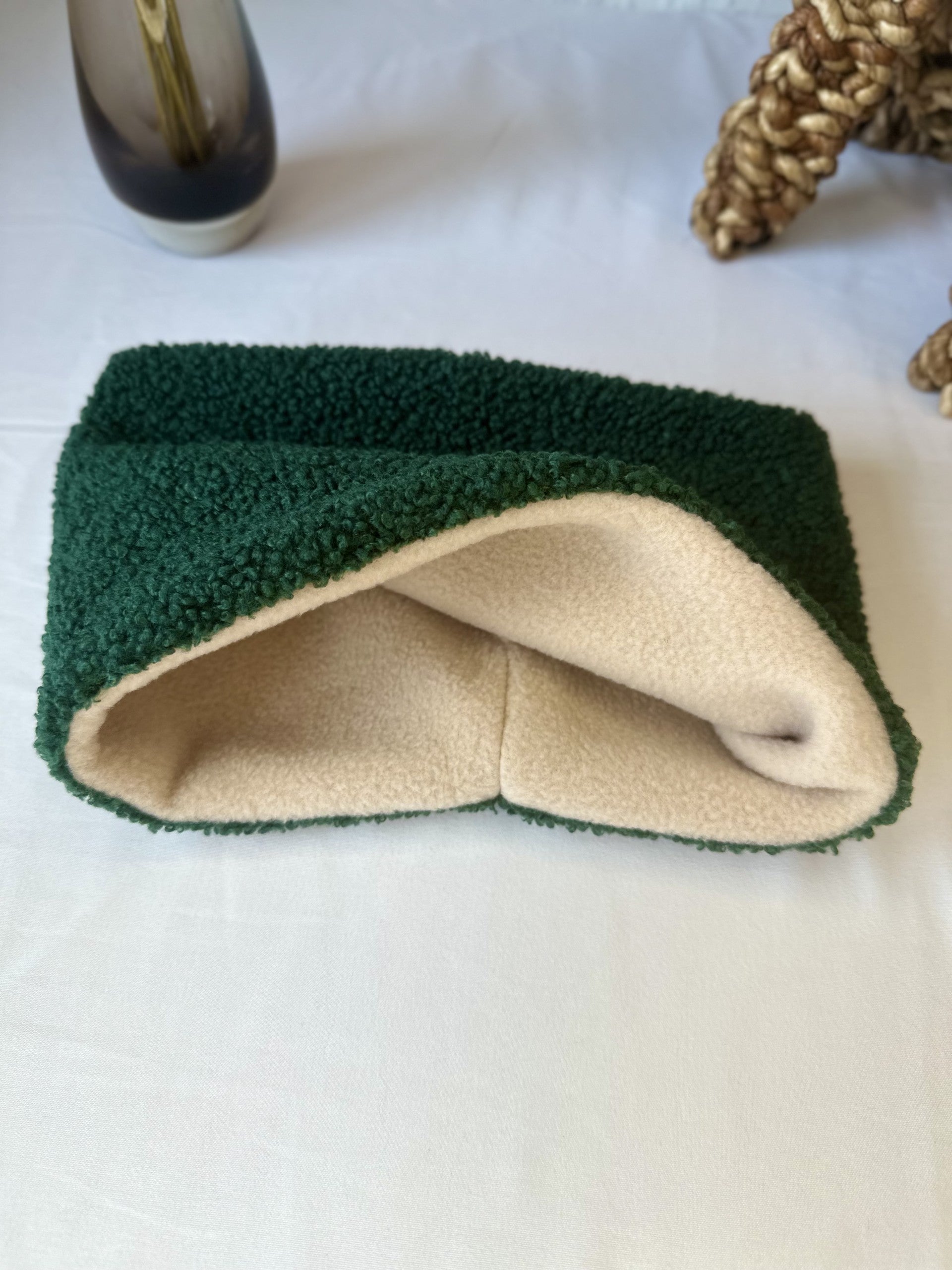 Our double sided Teddy Bear and Polar Fleece doggy snoods are all handmade and available in a variety of colours.