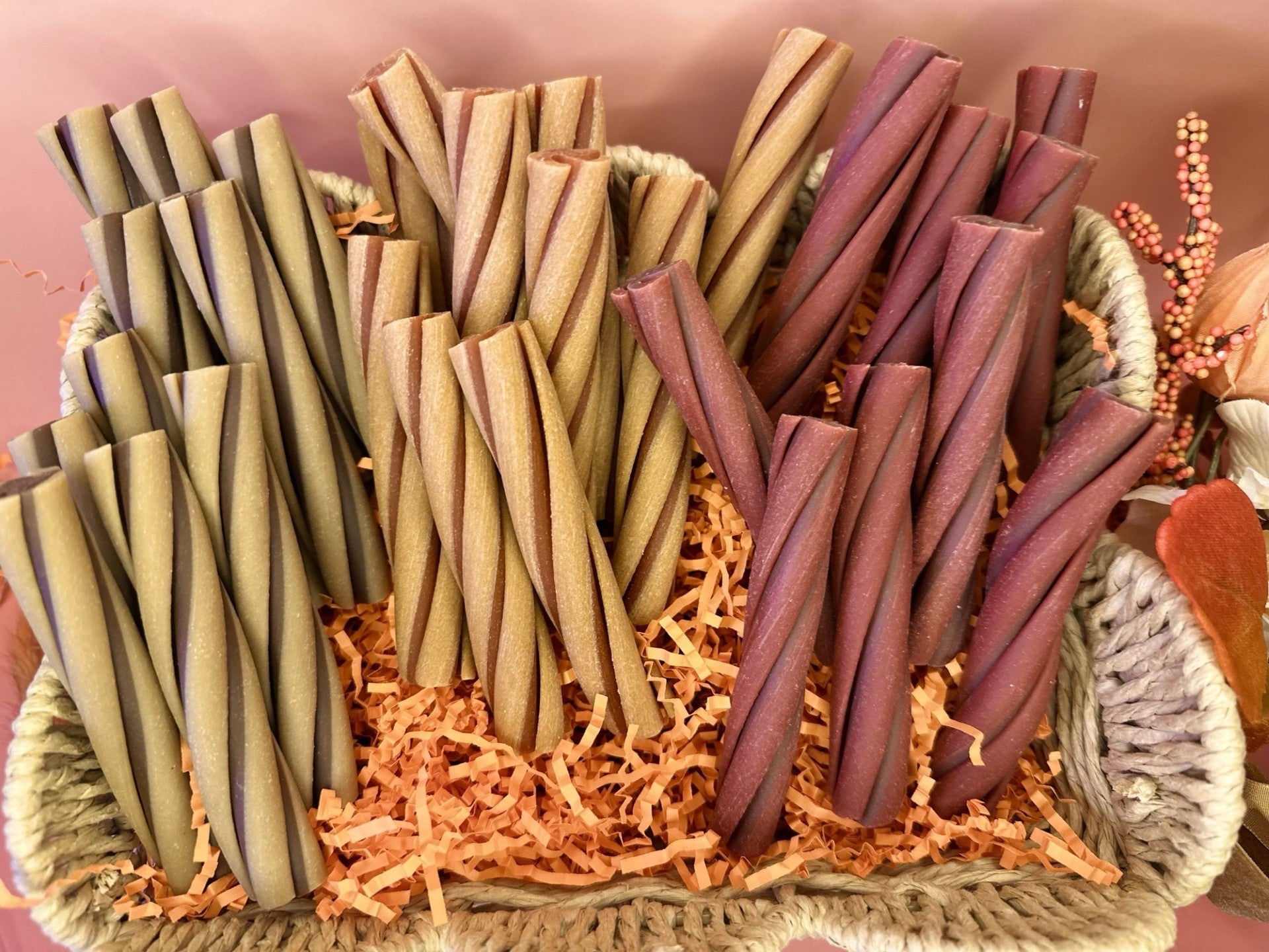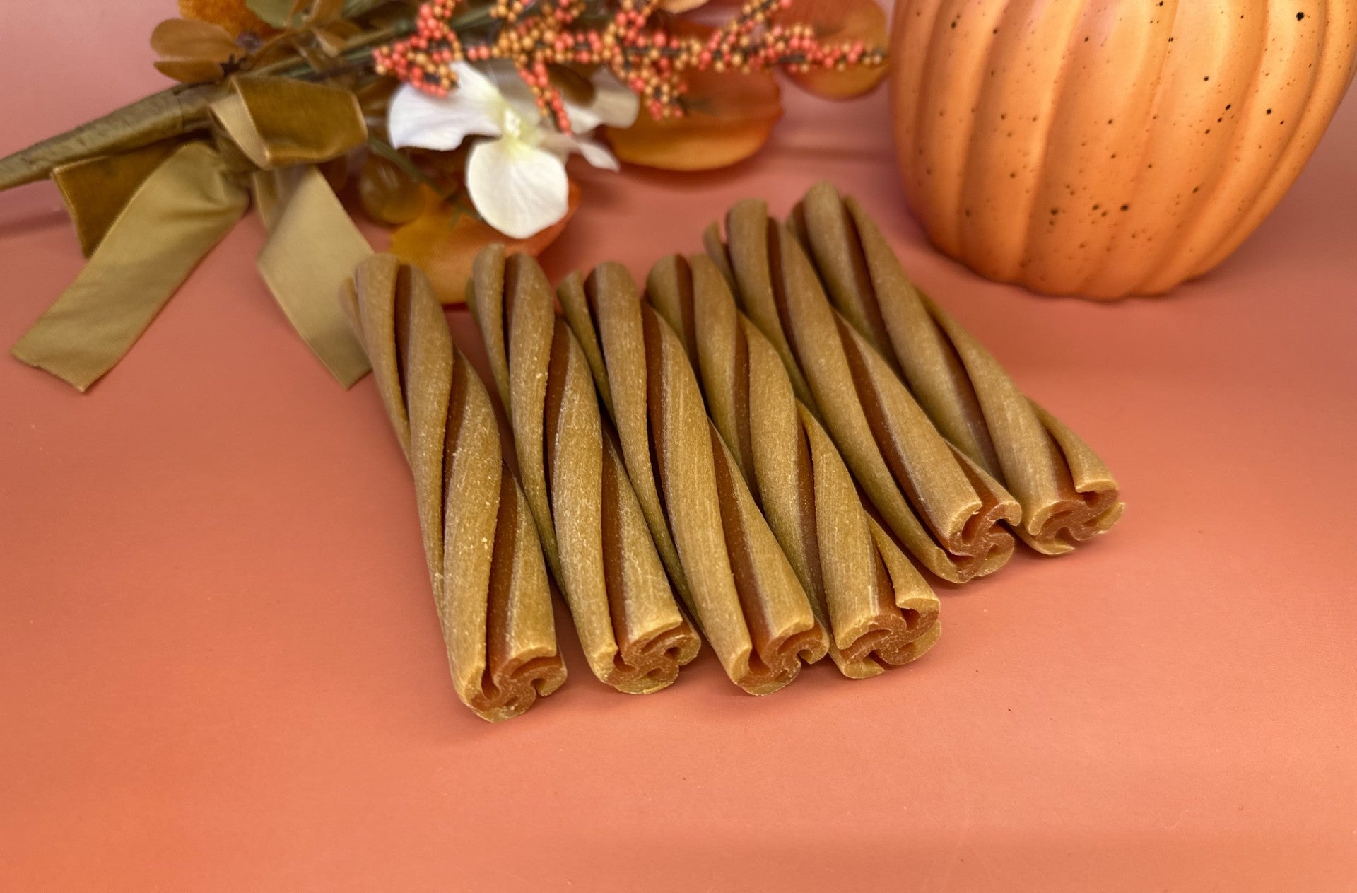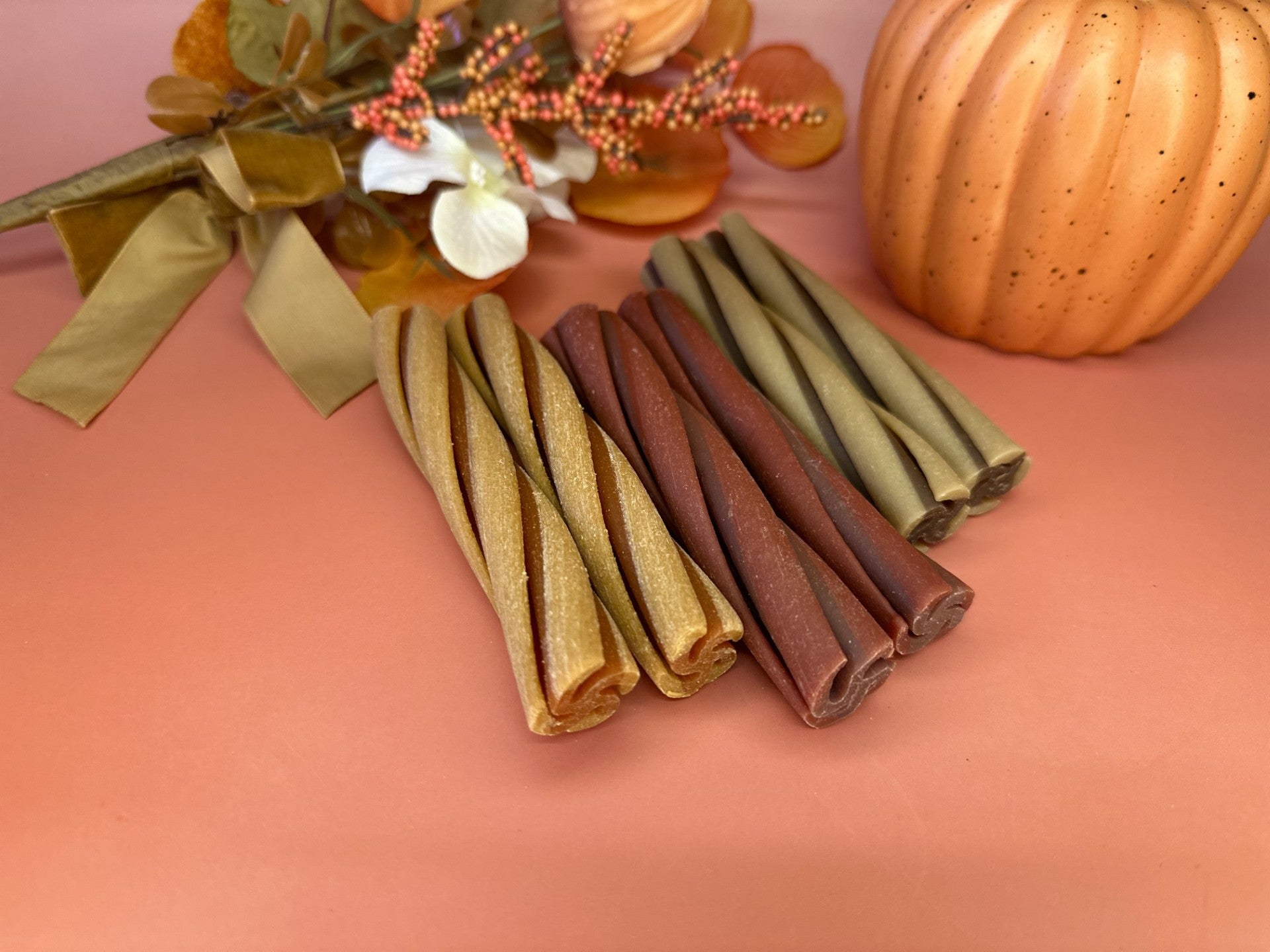 Pawfect dental tasty, twisty and totally tail-wagging chew that there is! Our veggie chews come in three deliciously wholesome flavours: