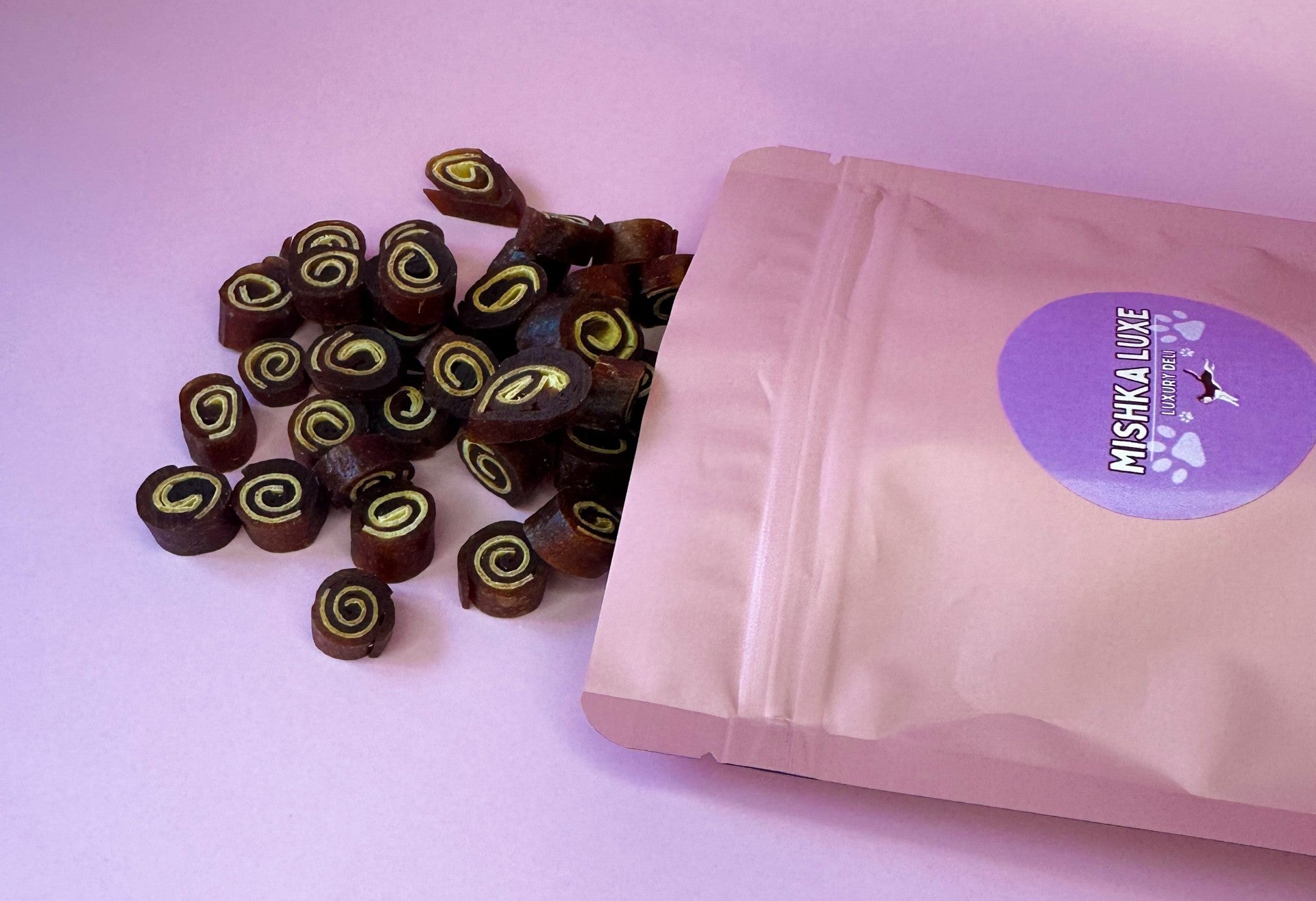Mishka Luxe Duck & Cod Mini Rolls are perfect for training rewards and provide a delicious treat for your dog to enjoy. Our small roll shaped chunks are made with tasty duck roll in cod and offer a particularly soft and juicy consistency.