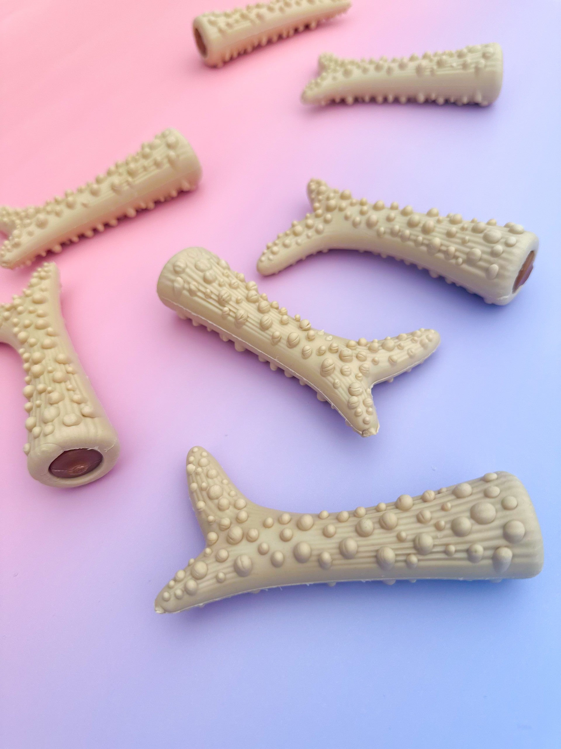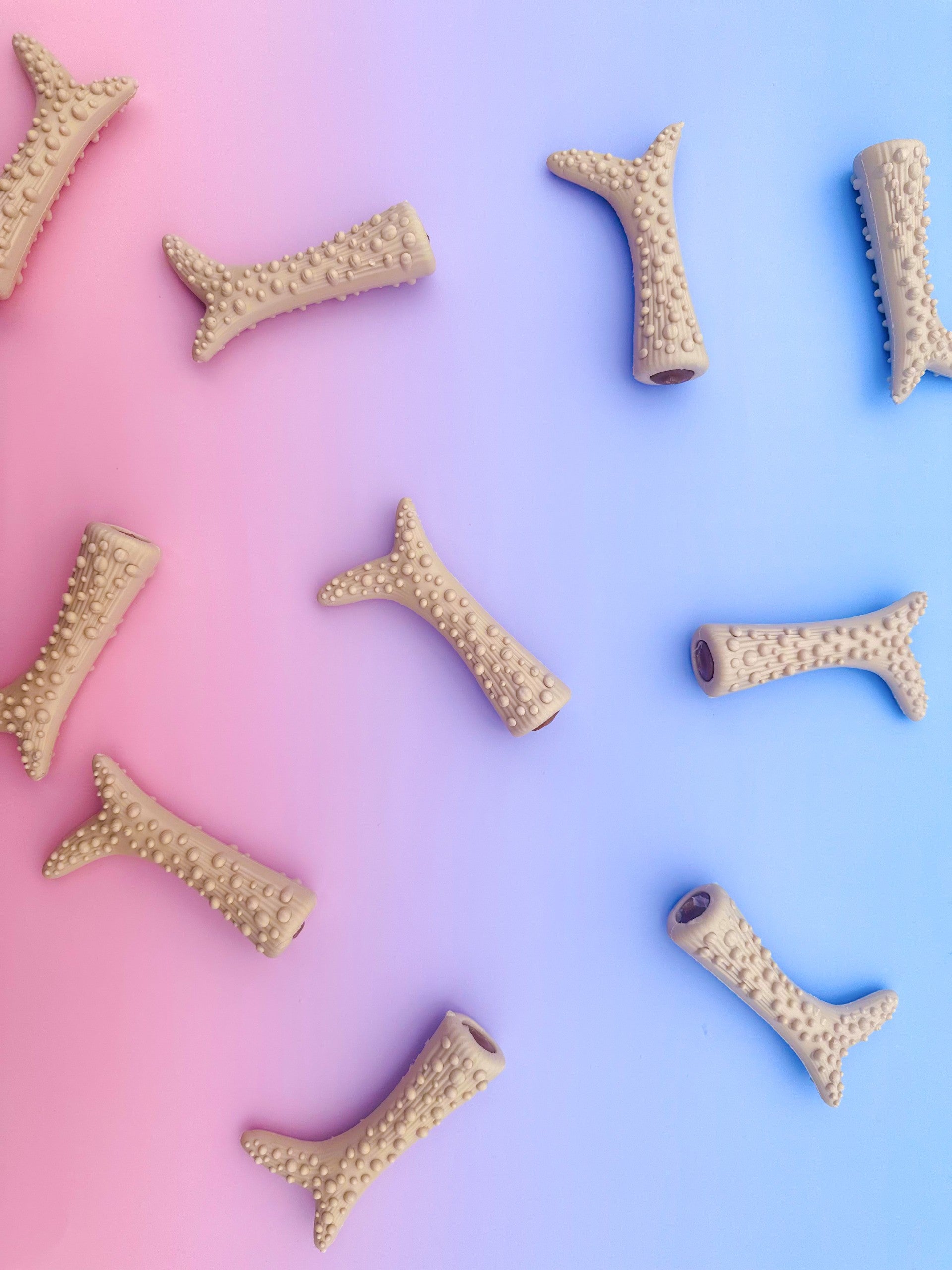 Our delicious vegan dog chews feature a fun antler shape with textured ridges to help clean teeth and massage gums. Filled with 100% pure peanut butter (free from xylitol and palm oil), they’re a healthy, planet-friendly treat that your dogs will love!