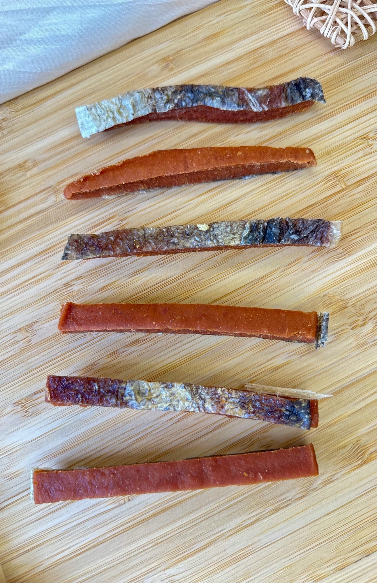 Treat your furry friends to the irresistible taste and health benefits of our Salmon Skin Strips. With their natural goodness and satisfying crunch, these treats are sure to become your dog's new favourite snack. Make your dog's tail wag with joy by providing them with a snack that is both delicious and nourishing!