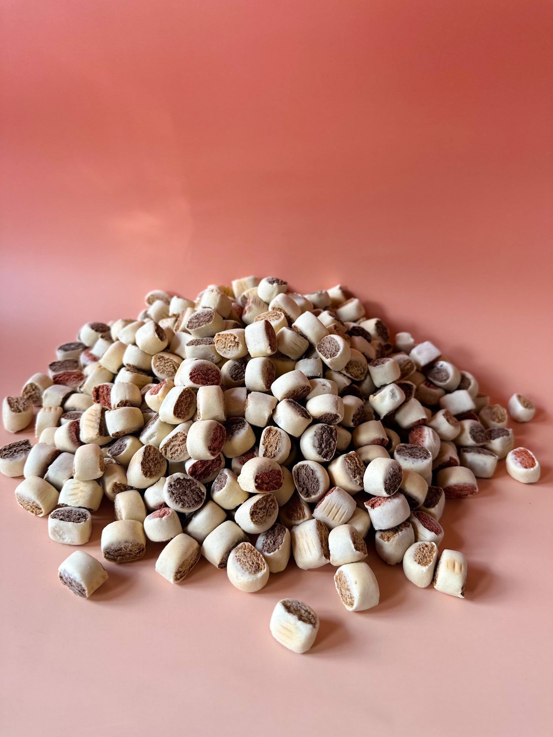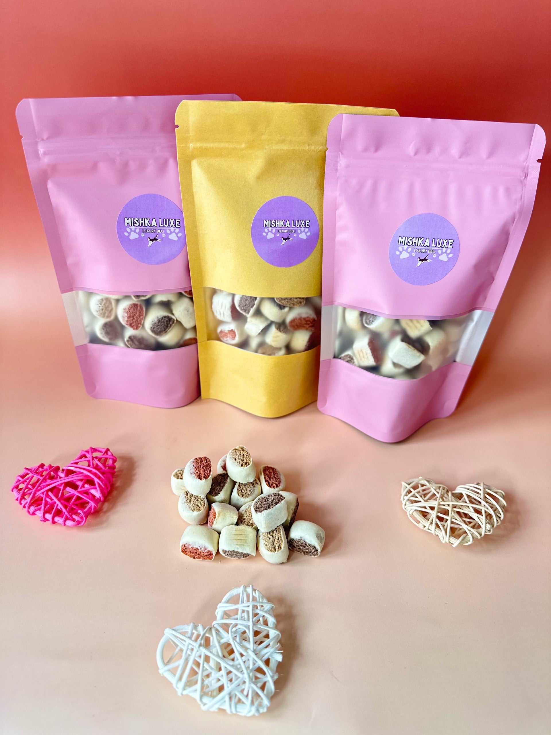Our meaty biscuits includes a selection of venison, ostrich and salmon enclosed meats with a crunchy gluten free biscuit.